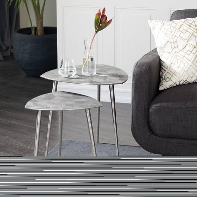 - •Triangular accent table set features two tables with intricate textured top in a nesting structure for optimal storage and display