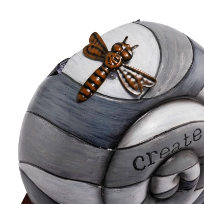- SNAIL GARDEN STATUE: Small snail statue with gray-toned striped shell with a copper-colored dragonfly accent and engraved with the word “create” to add an inspiring and adorable accent to your garden