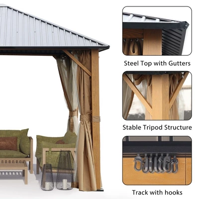Introducing the Aoodor Wood Grain Aluminum Gazebo. It features a sturdy aluminum frame with a wood-like color, providing durability and a natural aesthetic. The rust-resistant steel roof offers water-proof and UV protection. With included netting and curtains, you can customize privacy and ventilation. Enhance your outdoor space with this stylish and functional gazebo.