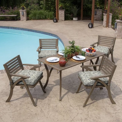 The Arden Selections Plush BlowFill Collection pairs soft polyfiber fill with long-lasting outdoor polyester fabric to create an ultra-comfortable outdoor patio dining cushion. This Tan Aurora Damask outdoor dining seat cushion has the following dimensions: 20 in L x 20 in W x 5 in T. The 100% printed polyester outdoor fabric features high UV pigments to protect from ultraviolet rays and resist fading, so your outdoor dining cushion looks vibrant for longer. Water protection helps your patio dining cushion withstand continued outdoor use, while easy cleaning with just soap and water ensures upkeep is low maintenance. Two sets of ties secure the patio dining cushion firmly in place, while a button adds a decorative touch. Inside this patio dining cushion is 100% polyfiber blowfill to help it retain shape and provide long-lasting comfort during outdoor use. Made from 100% recycled plastic bottles, the polyfiber fill provides an environmentally friendly and durable option for your backyard patio. Although this outdoor dining cushion is both water and UV-resistant, we recommend bringing it indoors when it rains or when not in use to preserve its lifespan and keep it looking beautiful.