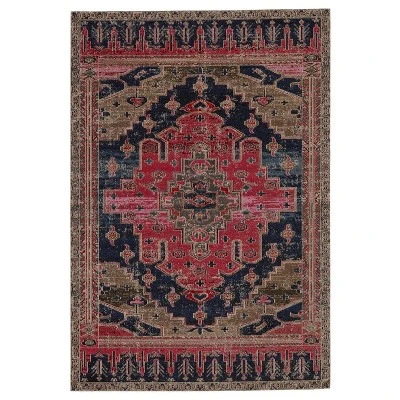 Capturing the beauty of antique Turkish rugs, the indoor-outdoor Polaris collection combines admired traditional designs with a durable, light-weight polypropylene construction. The Cicero rug features a bold take on a geometric medallion in bright pink, deep blue, gold, gray, and light taupe tones. This richly colored rug offers a global and statement-making addition to dining rooms, patios, and kitchens.