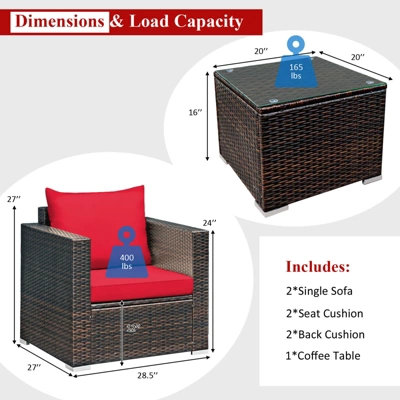 - Versatile & Practical Sofa Set: Designed with concise and modern style, the set is great to be placed in your garden, patio, balcony, poolside, backyard, lawn. Dimension of single sofa: 28.5” x 27” x 27” (L x W x H), hold up to 400 lbs. Dimension of coffee table: 20” x 20” x 16” (L x W x H), hold up to 165 lbs.