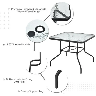 - Tempered Glass Table: Featuring high quality tempered glass with water wave design, the smooth tabletop allows you to clean it conveniently. And you can put various belongings on it. There is an extra hole on the bottom to help you fix the umbrella.