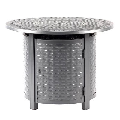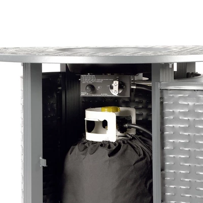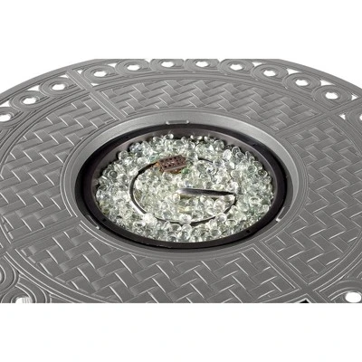 Bring the warmth and ambiance of this Round 34 in. x 34 in. Aluminum Propane Fire Pit Table with Glass Beads, Two Covers, Lid, 37,000 BTUs in gray Finish to your patio, deck or backyard. Featuring a stylish clean durable powder coated finish, this fire pit is complete with a durable rust-free solid aluminum design base, making it an attractive centerpiece for your outdoor living space. Complete with a 37,000 BTU stainless steel burner and integrated ignition, you can enjoy all the ambiance of a classic fire without the mess or danger of tending ashes. All of the complicated electrical and gas control components are preassembled unlike other fire tables. This fire pit comes with clear fire glass, a table lid, propane tank cover and a protective table fabric cover. The dimensions for the propane fire pit table are: 34″ L x 34″ W x 24.5″ H, 55 lbs.