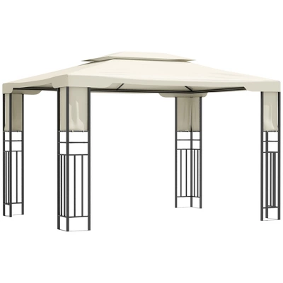 This 13′ x 10′ double roof gazebo is more than just a sun shelter; it provides an elegant modern touch to your backyard, garden, or other outdoor space. Featuring a solid steel frame that holds its shape underweight without bending and rain draining fade-resistant polyester. Protect guests from sunburns inside of a spacious floorplan. Each corner contains a stylish shelf designed to help you dine, drink, and decorate. So, get out and get Outsunny.