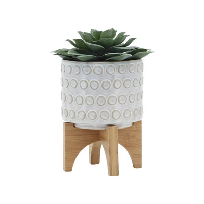 Sagebrook Home 5″ Wide Circle Pattern Round Ceramic Planter Pot With Wood Stand