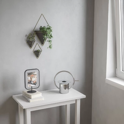 Trigg wall vessels are an exciting way to keep small indoor plants or other items, such as pens, pencils or even makeup accessories, on display and close at hand. Featuring a molded resin vessel and plated wire frame, these decorative vessels come with mounting hardware and are easy to hang. You can also group together multiple sets to create a mini indoor wall garden for your succulents or other small plants. Measures 4.5x 7.5x 2.5″ (11 x 19 x 6 cm).