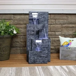 • SOOTHING WATER SOUNDS: This outdoor rock fountain cascades water down each tier, creating calming sounds. Once the water reaches the basin, the electric submersible pump recirculates it back up to the top of the fountain.