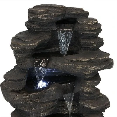 Add an extra natural element to the garden, the yard, or the patio with this large, rocky, outdoor waterfall fountain. Features like this one make it easy to capture the beauty and soothing aspects of a natural waterfall with its eye-catching waterfall features and relaxing ambiance. With expert detailing and a realistic appearance, this rock waterfall fountain will be a focal point in any landscaped area for many seasons to come. The polystone material it is made from is more durable and heavier than resin or fiberglass but still much lighter than concrete or stone fountains, so it is easy to maneuver around the yard while remaining durable to the elements. The LED lights illuminate this fountain at night.