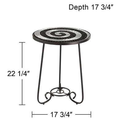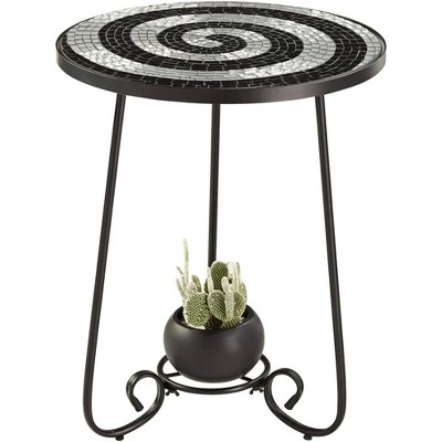 This round outdoor accent table features a spiral patterned tile mosaic top made from black and white glass pieces. The frame and curvaceous legs are constructed of black finish iron that will withstand the elements. A great way to add fresh style and function to your porch or deck.