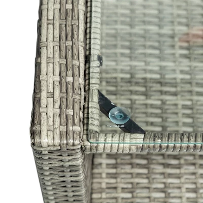 - Set includes two armchairs, one loveseat, one table with a 5mm glass tabletop with suction cups, cushions and pillows