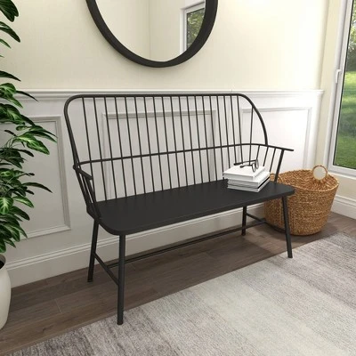 This bench is perfect for creating a focal point in your home with comfortable seating. So take a load off and relax on this decorative outdoor bench. Black bench carries a blend of style and function and will complement light colored pillows and natural grass baskets. This item ships in 1 carton. Suitable for indoor and outdoor use. This item ships fully assembled in one piece. Maximum weight limit is 400 lbs. Can accommodate 2 people. This is a single black colored patio bench. Farmhouse style. Iron structure is painted with a special coating to help protect it from the elements, iron may show signs of corrosion in salt air environments.