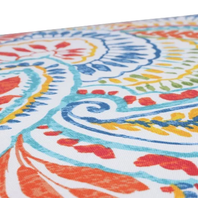 Give your patio or porch an intense splash of color with the hot paisley fabric pattern of this stylish set of two outdoor seat cushions. Their bold print design is set on a white ground in bright shades of blue, green, orange, red and yellow, perfect spicing up your outdoor ensemble. Made of 100% polyester fade-resistant fabric. Additional features of these outdoor seat cushions include square corners, 14″ ties and recycled polyester fill with zippered closures for easy removal. Also suitable for indoor use.